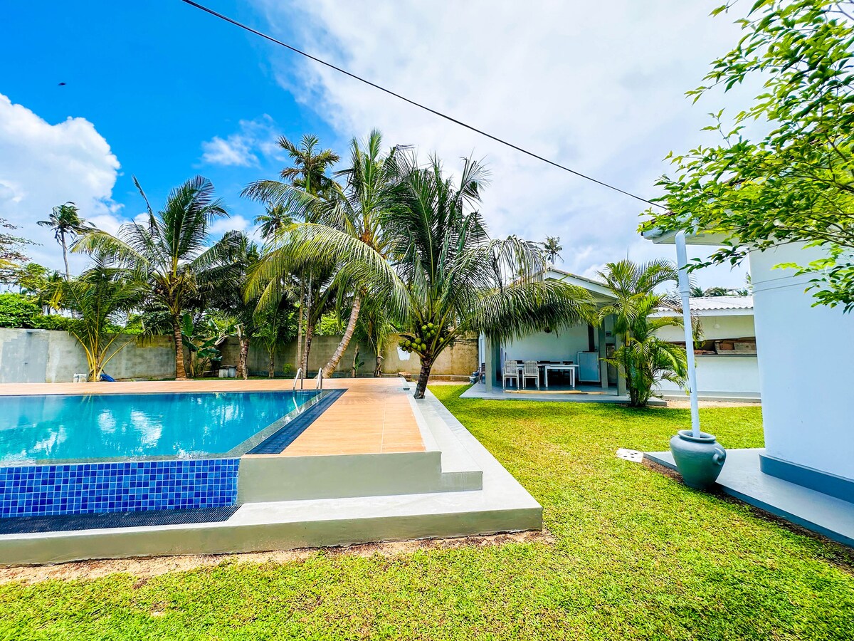 Butična obalna vila sa 3 velike spavaće sobe, 5 minuta hoda od slikovite plivačke lagune Dalawella Beach. Naša vila ima bazen prikladan za porodice, veliku zabavnu verandu i tropske vrtove sa jogom/sunčalištem. Brzi internet, vrtni zvučnici i moderna en-suite kupatila pružaju savršen odmor u Šri Lanki na samo nekoliko trenutaka od Indijskog okeana. Naše ljupko osoblje na licu mesta obezbediće besplatan doručak, a gosti će imati pristup i sopstvenoj privatnoj kuhinji.