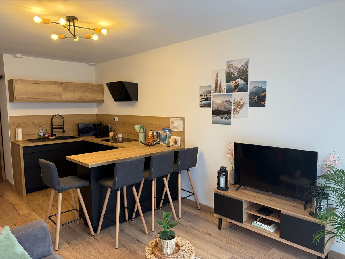 Šarmantna čahura u srcu Mižua - 40 m² Prostor Ova šarmantna dvosobna soba, uređena u stilu planinske kuće, sastoji se od: • Svijetla dnevna soba s udobnim kaučem, TV-om ravnog ekrana i trpezarijom • Potpuno opremljena kuhinja • Jedna spavaća soba sa bračnim krevetom • Kupatilo sa odvojenom tuš kabinom i toaletom • Ostava za vaše stvari • Ostava za skije • Jednostavno parkiranje u rezidenciji • Minibar u sklopu objekta sa slanim/slatkim proizvodima (plaćanje QR kodom)