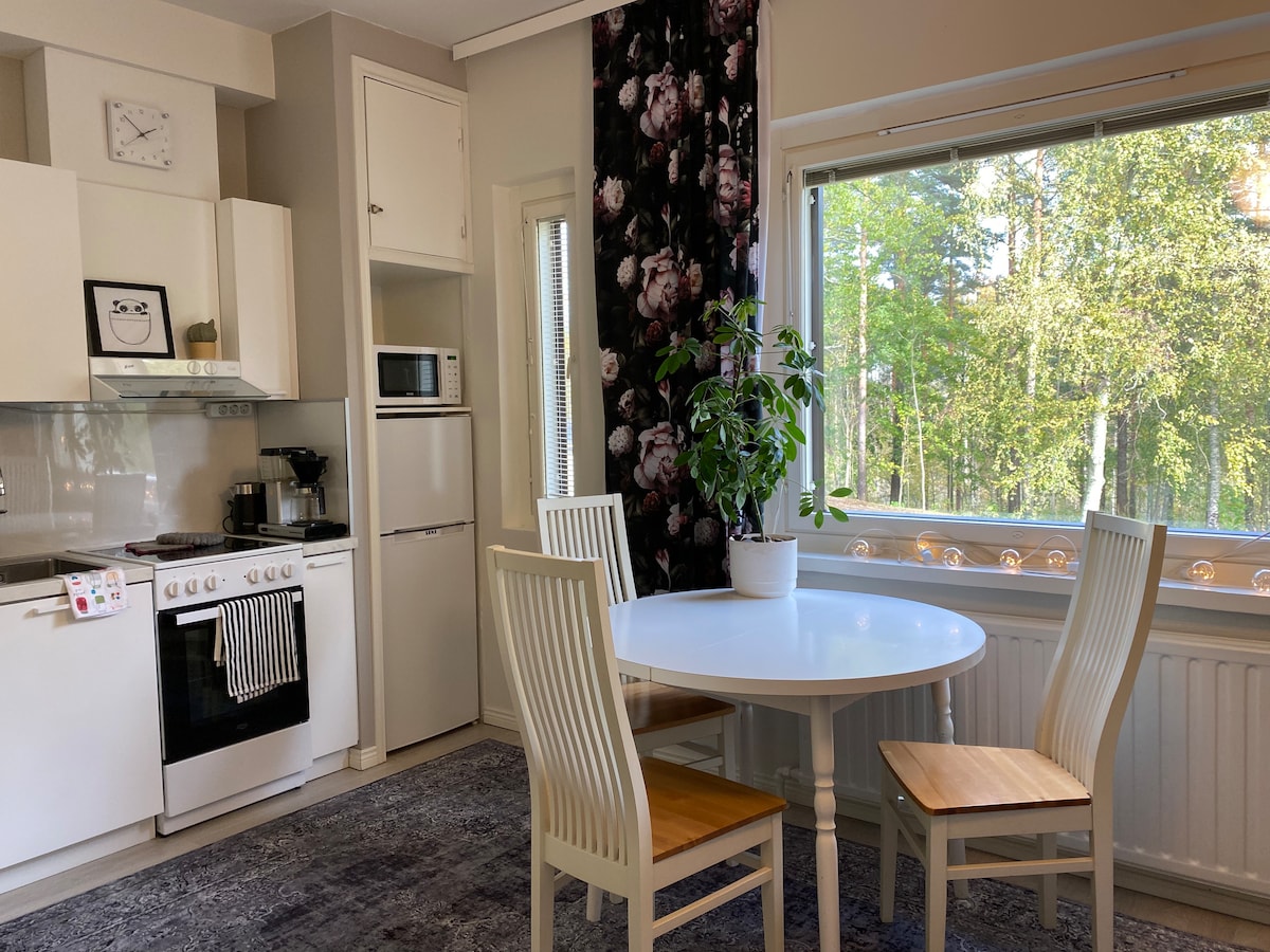Predivno renoviran i namješten dvosoban stan (32 m2) povezan sa zasebnom kućom, sa sopstvenim ulazom na nivou ulice. Možete ostati fleksibilni i nezavisno sa ključem. Pozajmljujemo vam bicikle besplatno (2) ako je potrebno. Jutarnje kupanje (100 m od plaže) ili džogirajte! Staze za trčanje počinju u susedstvu. Besplatno iznajmite sup, kajak ili čamac na vesla iz Urpola NatureCentra (200 m). Namirnice, apoteka, teretana u blizini, centar grada 1,5 km, Koncertna dvorana Mikaeli 3 km.