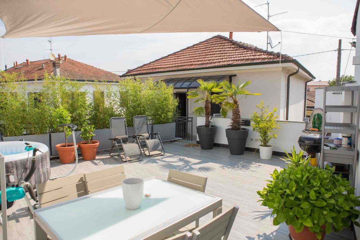 Stan na gornjem spratu od 40 kvadratnih metara sa ogromnom terasom i lepim pogledom na koji možete uživati u zapanjujućem zalasku sunca. 3 minuta hoda do metroa M2 Assago Milanofiori Nord i nekoliko stanica (oko 10 minuta) do centra Milana. 10 minuta hoda od Assago Foruma. Stan je otvoren prostor sa potpuno opremljenom kuhinjom, bračnim krevetom i prelepom privatnom terasom sa stanicom za roštilj. možete da se opustite u visećoj ležaljci ili da radite na velikom stolu na otvorenom. ZAISTA BEZBJEDNO PODRUČJE i tokom noći.