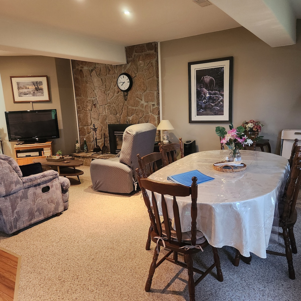 Bring the whole family to the country with lots of room for fun. A private apartment with it's own entrance, in our home, offers lots of space to roam but close to all amenities. The space includes 3 bedrooms, 3 piece bathroom with tub, a full kitchen, open concept living room dining room. A beautiful walk-out entrance to a covered patio with a garden view. Suitable for 6 adults and 2 children. All three bedrooms have queen size beds and bedroom 2 has a set of bunkbeds and a desk and chair.