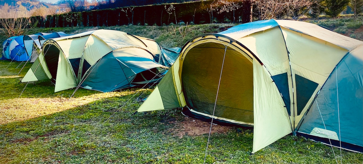 Šatori za kampovanje različitih veličina na zelenom travnjaku, idealni za parove, porodice i okupljanja s prijateljima. Poslužuje se pored bara u restoranu i toaleta.