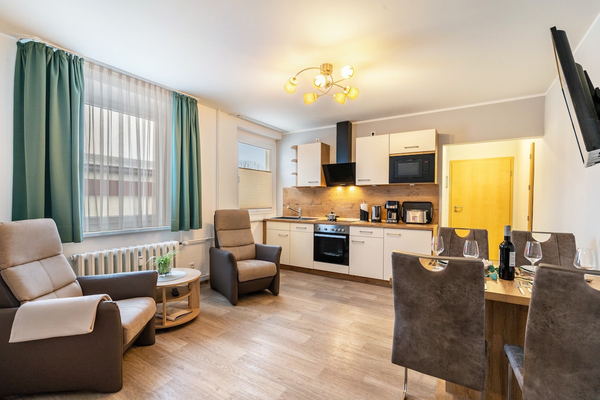 Central, modern holiday apartment in Meissen Enjoy your stay in our comfortable holiday apartment, just a few minutes' walk from the porcelain factory and the historic old town. Two separate bedrooms, an open-plan kitchen with dining area and a bathroom with bathtub and washing machine offer the utmost comfort. Wi-Fi, two flat-screen TVs and heating are included. Breakfast is available on request at the Burkhardt guesthouse or the Burkhardt apartment building.