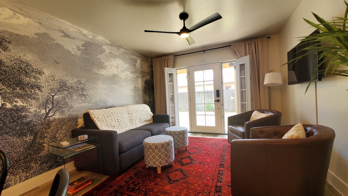 Opustite se u ovoj mirnoj, elegantnoj seoskoj kućici smještenoj usred voćnjaka badema na privatnom putu. Sakupite sveža jaja od pilića za doručak u kombinaciji sa svežim voćem i povrćem iz bašte! Provedite mirno veče pijuckajući piće na tremu ili se opustite u šetnji uz reku. Geografski gledano, volimo da kažemo da se nalazimo između mosta Golden Gejt, San Franciska i Half Dome u nacionalnom parku Yosemite.