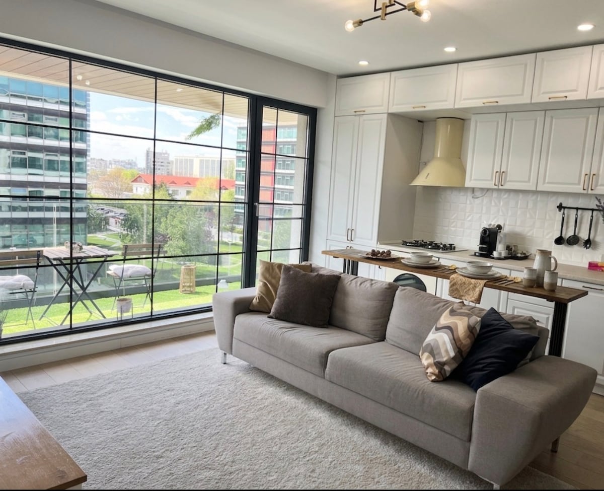 Dobro došli u ovaj elegantni stan na 11. spratu sa nevjerovatnim pogledom na Bukurešt! Opustite se u visećoj stolici na balkonu, kuvajte u potpuno opremljenoj kuhinji i uživajte u modernoj udobnosti. Namjenska trpezarija i radni prostor, udobni kreveti i mnogo ostave. Smješten u novom stambenom kompleksu, stan je udaljen samo 5-7 minuta do metroa, 15 minuta do aerodroma. Savršeno za parove ili male grupe. Besplatan parking, klima-uređaj/grijanje, Wi-Fi i sve što vam je potrebno za odličan kraći ili duži boravak.