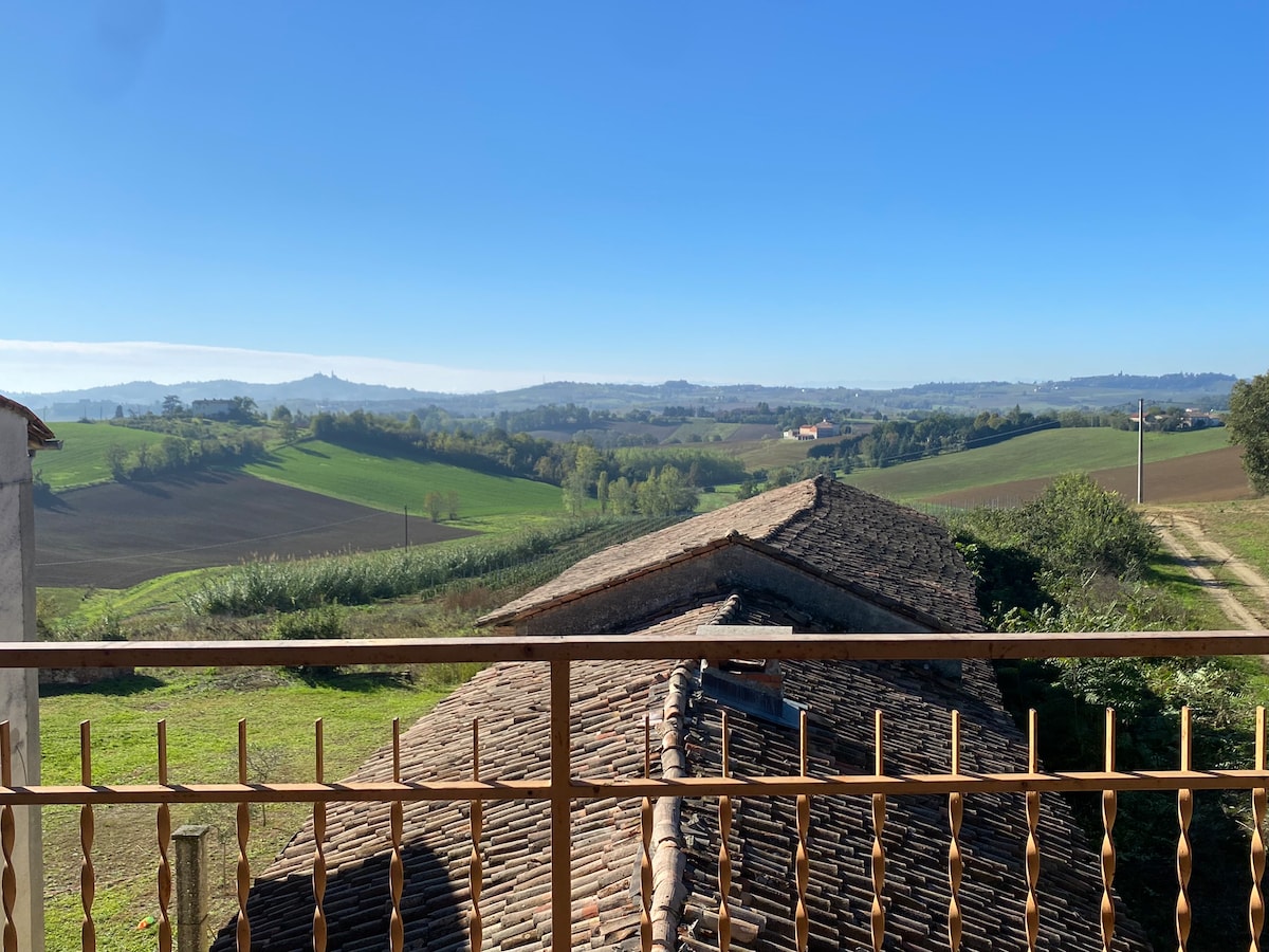 Elegantna seoska kuća smještena u brdima Monferata. Nezavisni smještaj za goste, napravljen od ambara, opremljen je dnevnim boravkom sa kuhinjom, udobnim kupatilom i velikom i svijetlom sobom sa bračnim krevetom i kvadratnim i pola kreveta idealnim za par, porodicu ili grupu prijatelja, do 3/4 osobe. Iz stana možete uživati u očaravajućem panoramskom pogledu, kao i sa velike terase na kojoj poslužujemo bogat doručak. Na raspolaganju su i spoljni prostori za opuštanje.