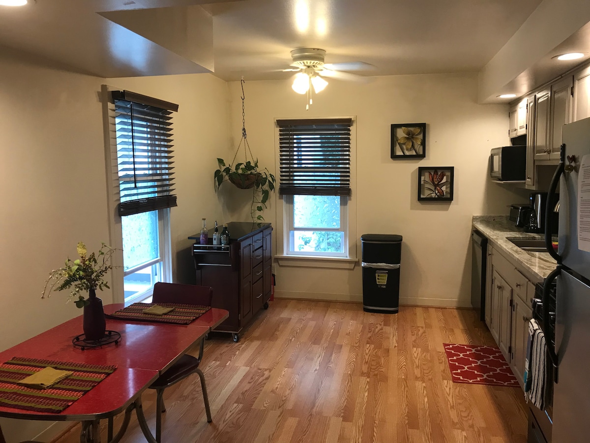 Udoban, super čist stan na spratu, miran, ali samo pola bloka od popularnog područja sa lokalnim buticima i više od 10 restorana. 1 spavaća soba sa bračnim krevetom, nedavno renovirana kuhinja i kupatilo, udobna kućna kancelarija sa Wi-Fi mrežom za rad na daljinu, udoban dnevni boravak sa TV + Roku Stick, HD antenski kabl i DVD plejer. Ukusno uređen i opremljen sitnim detaljima i svim osnovnim potrepštinama koje su vam potrebne za jednostavan život! Pozivajući verandu da se opustite. Besplatan veš i parking van ulice na ograđenom prilazu.