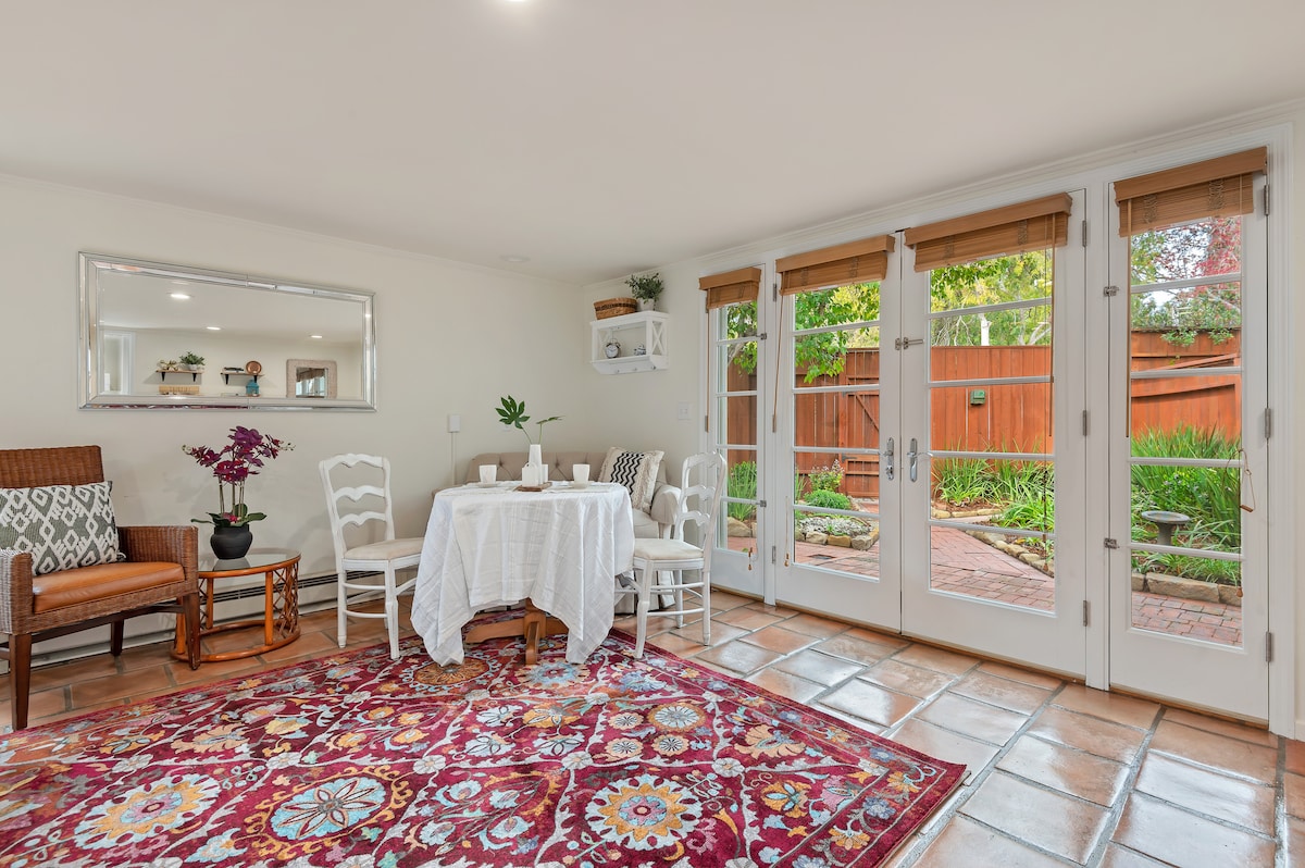 NAJBOLJA LOKACIJA i privatna! U srcu donjeg sela Montecito imate elegantnu zasebnu seosku kuću sa privatnim ograđenim parkingom i zasebnim ulazom. Prošetajte svuda! Igrajte boćanje ili šetajte i kupujte u Montecito Country Martu za večeru i sladoled. Postoji privatna terasa u kojoj možete uživati u čaši vina u večernjim satima. Butterfly Beach je udaljen 10 minuta hoda. Novi krevet, prostrano kupatilo, klima-uređaj i grijanje, velika TV i ažuriranja.