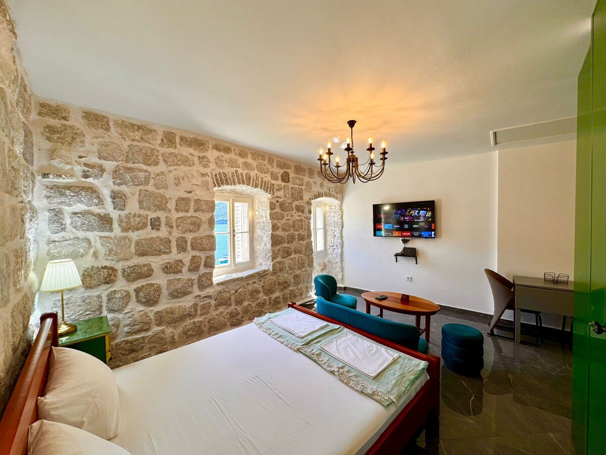 Studio se nalazi na drugom spratu i nudi zadivljujući pogled na Kotorski zaliv, posebno na jedno od njegovih najslikovitijih područja — Verige. Gosti imaju pristup prostranim terasama ispred kuće, koje pokrivaju 200 m², savršene za opuštanje na otvorenom. Studio je nedavno renoviran u junu 2025. godine, što osigurava svjež i udoban boravak.