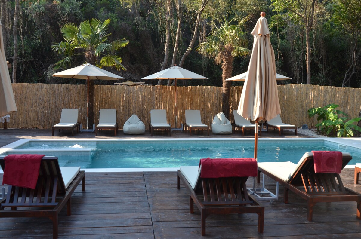 Uživajte u zvucima prirode kada boravite u ovom jedinstvenom smeštaju. Usred oaze i malo udaljen ( 1600 m) od plaže Žanjik i na visini od 350 metara je parcela. Probudite se uz ptice koje cvrkuću u prozračnim senkama maslinika. Na privatnoj kaskadi i terasi nalazi se ovaj veliki i prelepi šator. Na istom zemljištu koje se proteže na više od 1600 kvadratnih metara nalazi se drvena seoska kućica i jedan nešto manji šator. Dobro došli!