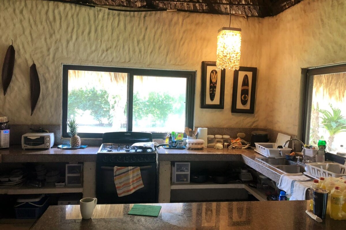 Kuća na plaži 100 metara od mora, sa velikim bazenom (dužine 11 metara) sa svežom vodom. **PRIJAVA 10:00 - ODJAVA 15:00** Spavaće sobe sa klima-uređajem, opremljenom kuhinjom i privatnim parkingom. Kuća je cirkulisana i isporučena u kompletu sa čistom posteljinom i jastucima. Nema nijednog prostora koji se dijele sa drugim ljudima. Niska vozila mogu da uđu bez ikakvih poteškoća. Nalazi se na putu od 5 km do Monteraka, prelazeći most od Iztape do Monterrika.