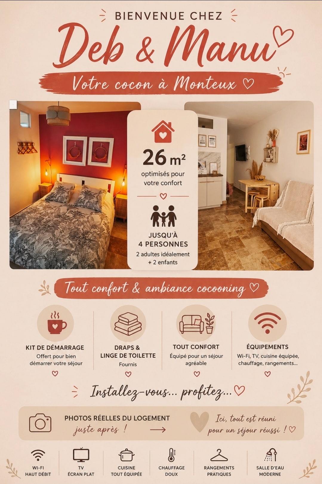 Dobro došli u Maison de Clarine u Monteu, jednospratnoj vili koja kombinuje udobnost i eleganciju, savršenu za boravke sa porodicom ili prijateljima! Ova lijepa kuća može da ugosti 6 osoba sa 3 svijetle spavaće sobe, od kojih svaka ima svoje privatno kupatilo. U potrazi za opuštanjem, avanturom ili otkrivanjem, Maison de Clarine je savršen izbor za istraživanje Provanse. Sve je tu za nezaboravan boravak!