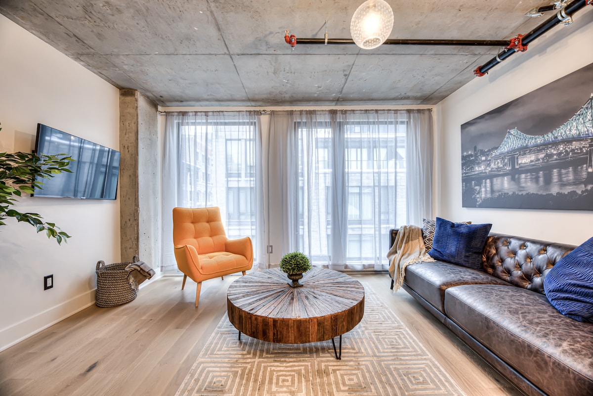 Stunning Old Port penthouse combining historic charm with sleek modern design. Sleeps 8 across one private bedroom and two stylish lofted rooms, each with tall partitions and locking doors. Soaring ceilings, exposed brick, and warm, elegant finishes throughout. Enjoy a chef’s kitchen, 65" HDTV & projector for movie nights, a gaming nook, and a compact office space. Steps from Montreal’s best dining, shops, and culture.