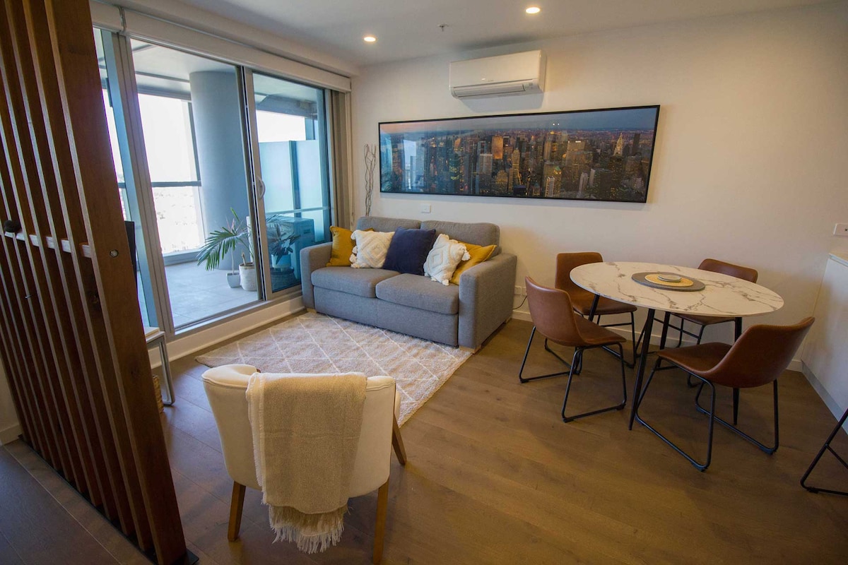 Ovaj stan se nalazi na 8. spratu JEDINOG Flemingtona, nasuprot trkališta Flemington. Balkon i glavna spavaća soba imaju predivan pogled na grad. Postoji jedan podrumski prostor koji je takođe dostupan liftom. Gosti takođe imaju potpun pristup bazenu i teretani na krovu Infinity (ali „Objekti za rekreaciju su otvoreni samo za upotrebu od 6:00 do 22:00). Minuta do CBD-a i nekoliko sekundi od javnog prevoza, gradskog linka i kupovine.