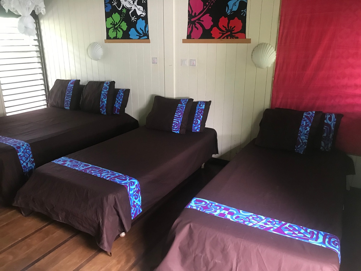 Smještaj u zelenom okruženju, pristup laguni 3 minuta hoda mogućnost postavljanja kajaka. Pogled na Tahiti. 15 minuta od trajekta, vodopadi . 3 spavaće sobe jedno kupatilo. 75 €\noćenje dvokrevetne sobe i 50 € po noćenju za jednokrevetnu sobu. Uzimam samo jednu porodicu Kuća od 140 m2 sa natkrivenom terasom, dnevnim boravkom i stolom i šumovitim zemljištem. Unutrašnjost sa privatnim prostorom, zajednička soba sa kuhinjom za deljenje, jednostavna i čista. Pratiću vas kajakom za posmatranje delfina i kitova.