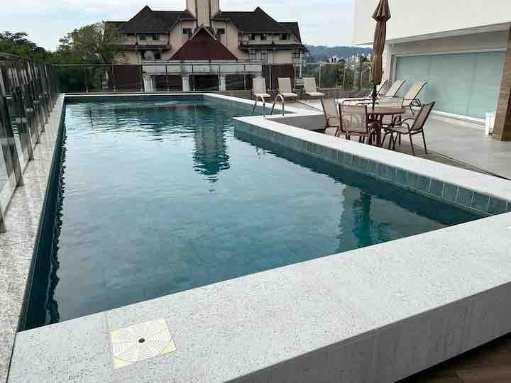 🌟 Dobro došli u novo i luksuzno potkrovlje u živopisnom srcu Blumenaua! 🌟 Boravićete na 10 minuta hoda od njemačkog sela i na ulici koja ima nekoliko barova i restorana. Otkrijte jedinstveno urbano utočište. Ovo potkrovlje je prava oaza udobnosti i savremenog stila. Zapanjujuća krovna terasa sa blistavim bazenom i panoramskim pogledom koji obuhvata suštinu grada. To je savršeno mjesto da se opustite u zalasku sunca ili da se divite gradskim svjetlima.