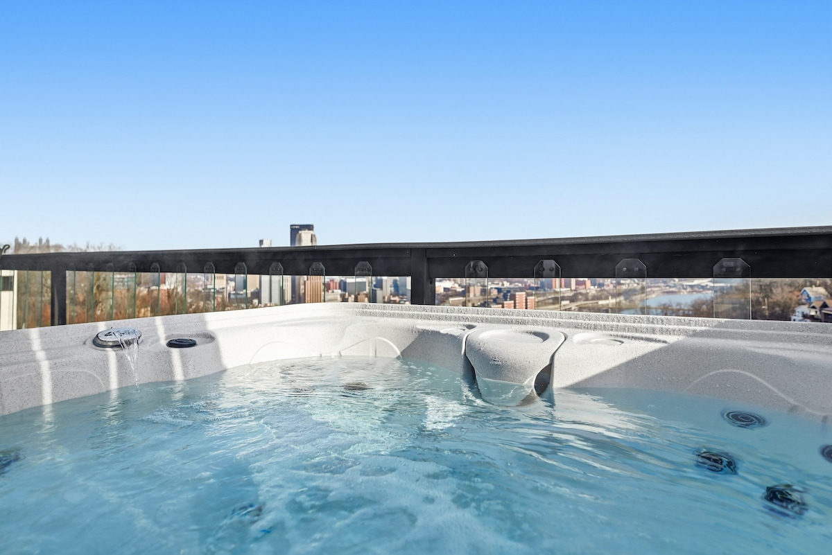 Pobjegnite u ovaj elegantni apartman sa 2 spavaće sobe sa privatnom hidromasažnom kadom sa pogledom na Pitsburg! Na nekoliko koraka od Coughlins Law, Shiloh Street i Monongahela Incline (lokalni favoriti za objedovanje i razgledanje!). Savršeno za parove, samostalne putnike ili male grupe koje traže opuštajući boravak u Pitsburgu! ➢2 bračna kreveta (širine 150–179 cm) ➢Dva nivoa s pogledom na Pitsburg (privatni i namješteni) ➢Radni prostor ➢Potpuno opremljena kuhinja ➢Podrška za goste 24/7 ➢garaža dostupna 7 vrata dalje