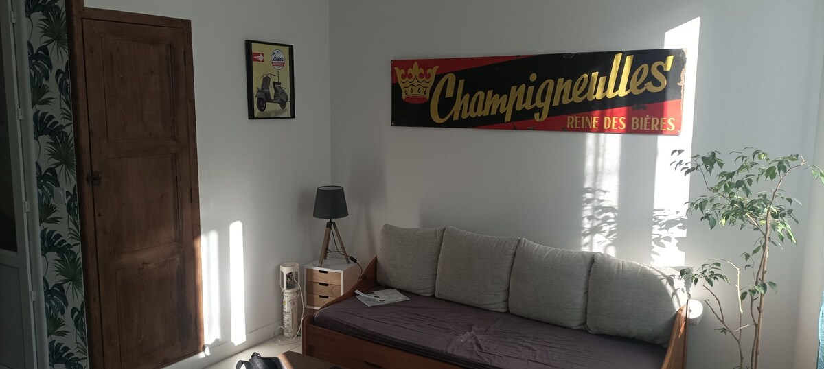 Opuštanje je zagarantovano u ovom uzvišenom studiju, sa svojim cvjetnim dvorištem, pergolom, lijepom kuhinjom i tuš kabinom. U blizini kanala Canal du Midi. Udobno malo gnijezdo na dnu borove šume. Maxi comfort and super equipped in a small village perfect located for visit our beautiful region. Gosti mogu da parkiraju automobil ispred objekta ili bicikle na unutrašnjem dvorištu.