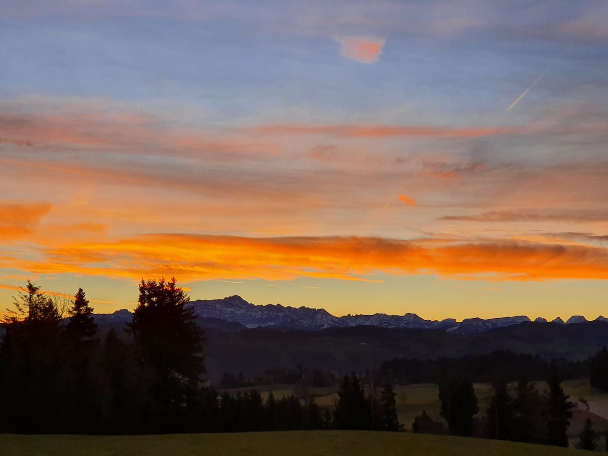 Sunčani dvosobni stan sa zasebnim ulazom i sedištem u samostojećoj kući sa pogledom na Säntis. Ruralno, brdovito područje idealno za planinarenje i vožnju biciklom. Prodavnica namirnica u selu non-stop. Grad Vil (ruta Cirih-St. Gallen) sa javnim prevozom udaljena je 20 minuta. Do stana se može doći za 5 minuta od autobuske stanice. Kuhinja je potpuno opremljena, dnevni boravak sa velikim kožnim kaučem. Mašina za veš, mašina za sušenje veša u konsultaciji za zajedničku upotrebu. Parking je uključen.