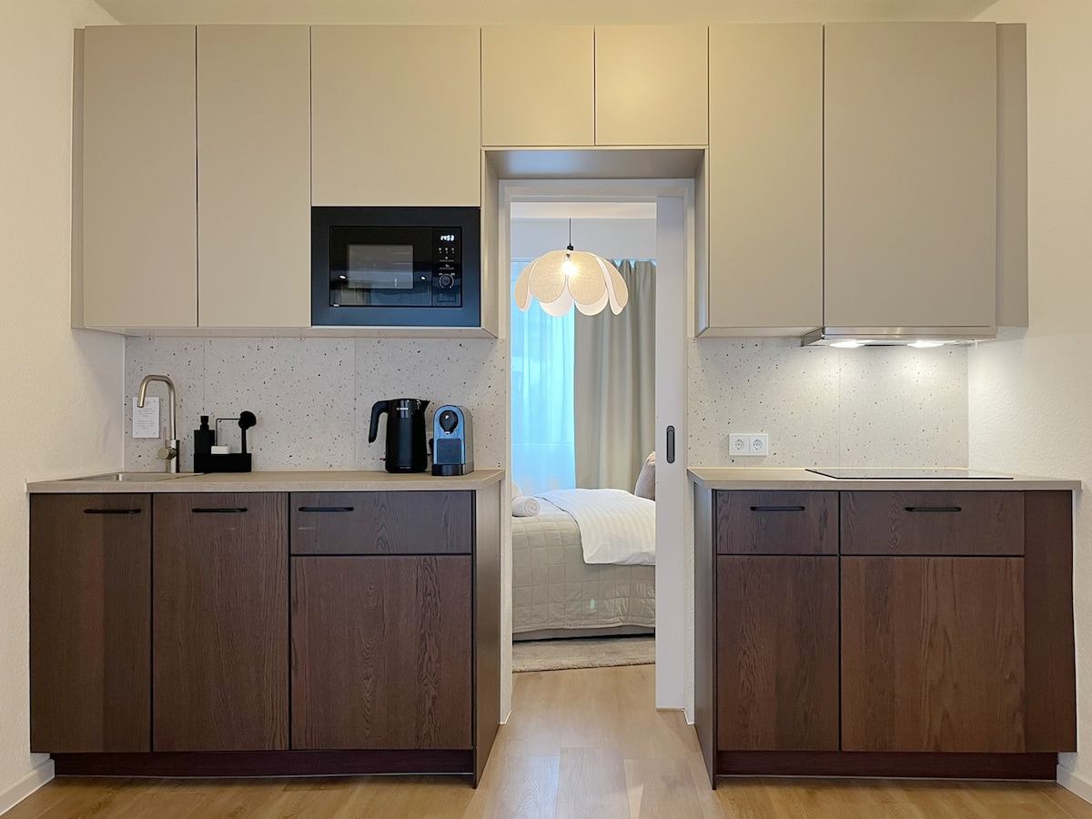 Zasebne spoljne stepenice (1. sprat) vode vas do savršeno smještenog stana u samostojećoj kući. Na apsolutno mirnoj lokaciji, a ipak samo 8 minuta od centra (bicikli se mogu iznajmiti, 10,00 €/We), impresionira kuhinjom 1a, modernim kupatilom (BD, podno grijanje), saunom na zahtjev, terasom sa pogledom na baštu/ tendom, sveobuhvatnim roletnama, prostranom spavaćom sobom i svijetlim dnevnim boravkom sa pristupom terasi. Idealno i za duže boravke (radni prostor sa radnim stolom).