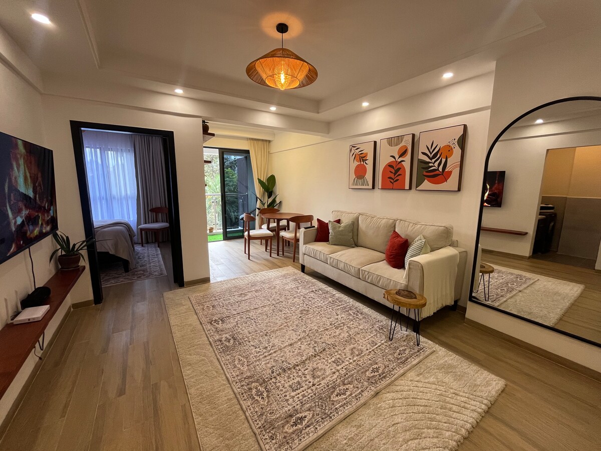 This stunning one-bedroom apartment offers a blend of modern sophistication and earthy Boho style. Situated in the vibrant Westlands area of Nairobi. 400 meters from the prestigious GTC Mall and the JW Marriott Hotel, placing shopping and entertainment within immediate reach.The apartment is a walking distance to the Sarit Centre. The building has full amenities which include: High-speed Wi-Fi 24/7 security, self check in Fully equiped kitchen Luxurious bathroom Backup power Rooftop Gym