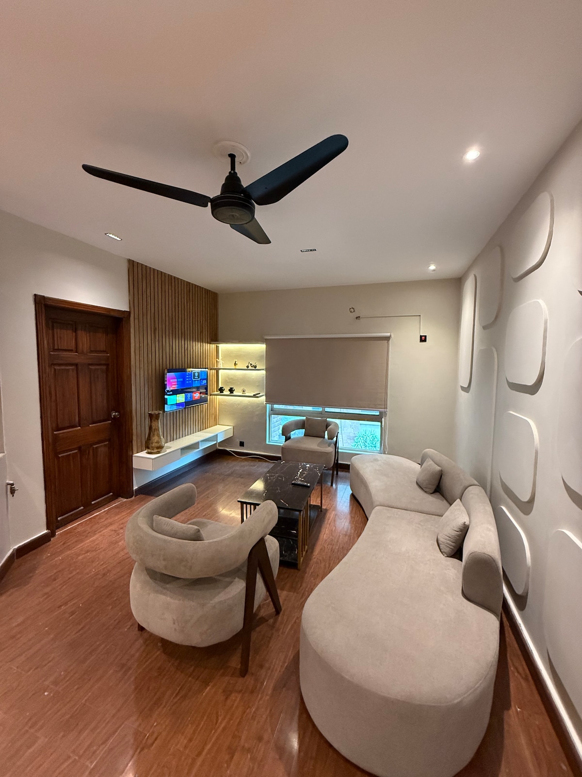 Moderan gornji dio sa 3 spavaće sobe u Bahria Town Phase 8, dizajniran kao butik hotel. Osjećajte se kao kod kuće, ali sa modernim detaljima i hotelskom udobnošću od 5 ⭐️. 🛌 Svaka spavaća soba ima veliki bračni krevet, privatno moderno kupatilo, inverter klima-uređaj, pametni TV od 55 inča sa Netflix-om i drugim aplikacijama za strimovanje. 💠 Uživajte u brzom Wi-Fi mreži, besplatnom doručku na zahtev, potpuno opremljenoj kuhinji, perionici veša u sklopu objekta i toploj vodi non-stop. Bezbedan, ograđen kompleks sa video-nadzorom, električnom ogradom sa spoljne strane, pomoćnikom na licu mesta non-stop i besplatnim parkingom.