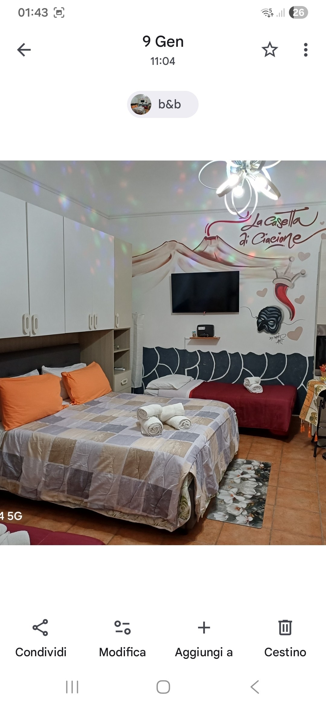 Vlasniku stana je vijećnica opštine Napulj dodijelila nagradu za žene i gostoprimstvo za autentično gostoprimstvo koje nudi gostima. Kuća se nalazi u istorijskom centru Napulja, u neposrednoj blizini poznate kapele San Severo. Objekat se nalazi na spratu zgrade sa kraja 17. vijeka, sa liftom. Lift radi sa mašinom za kovanice i svaka vožnja košta 5 centi koje će vam obezbijediti vlasnik.