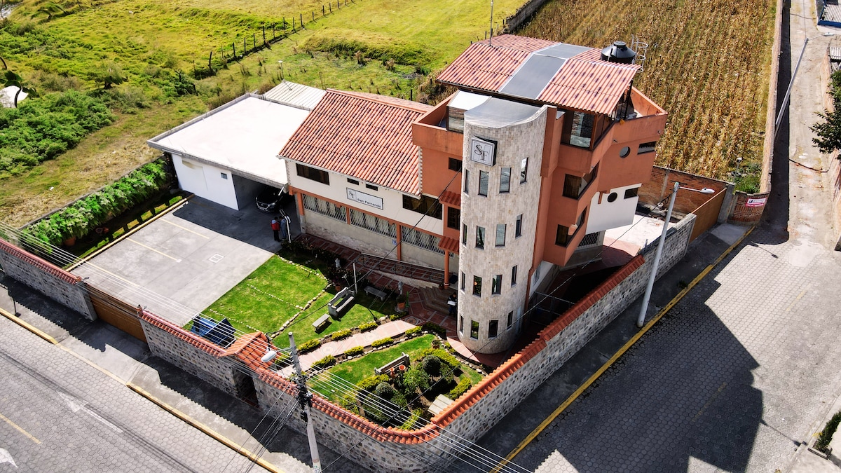 Prelijepa soba 6 minuta od aerodroma Kito. ✈️ Uključuje: Doručak 🍳 ☕️ 🥐 🍇 🥤 privatno kupatilo topla voda 🚿 Možemo da organizujemo da vas pouzdani legalni taksiji čekaju na aerodromu uz dodatnu naknadu. 🚕 Ako želite uslugu masaže, raspitajte se o našim paketima i cijenama. 💆 💆♀️. Recepcija non-stop. Uživajte u najboljem iskustvu na aerodromu Tababela-Kito
