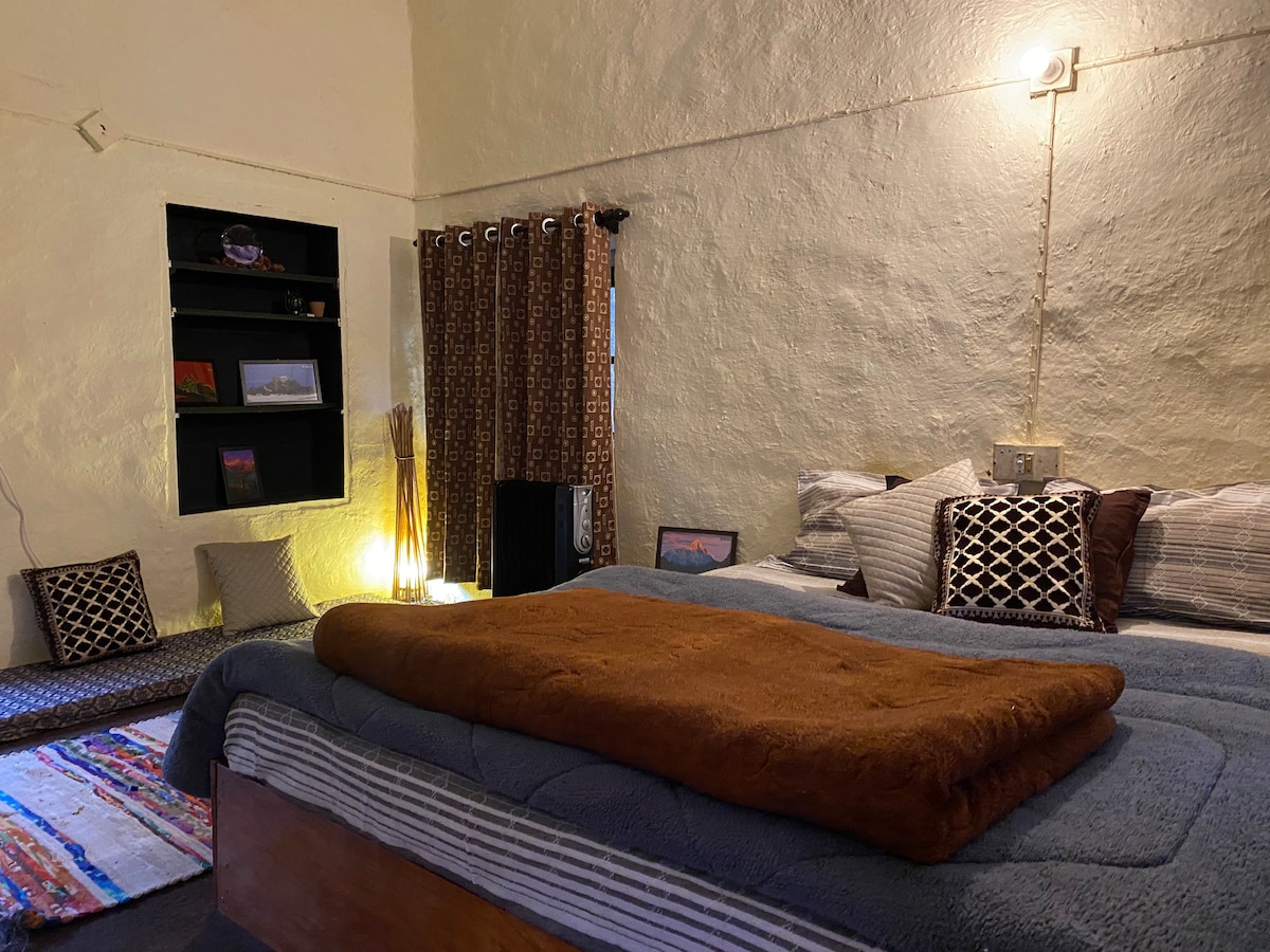 Zamislite da se probudite uz pogled koji oduzima dah na vrhove prekrivene snijegom, svjež planinski vazduh koji vam ispunjava pluća. Udobno utočište: rustikalni studio smješten usred zelenog podnožja Himalaja. Izgrađen od kamena i drveta lokalnog porijekla, ovaj smještaj odiše toplinom i šarmom. Unutar vašeg studija: Izložene drvene grede, kameni zidovi i tradicionalna peć na drva stvaraju autentičan planinski ambijent. Dobro opremljena kuhinja, privatno kupatilo i udoban prostor za spavanje pružaju opuštajući boravak.