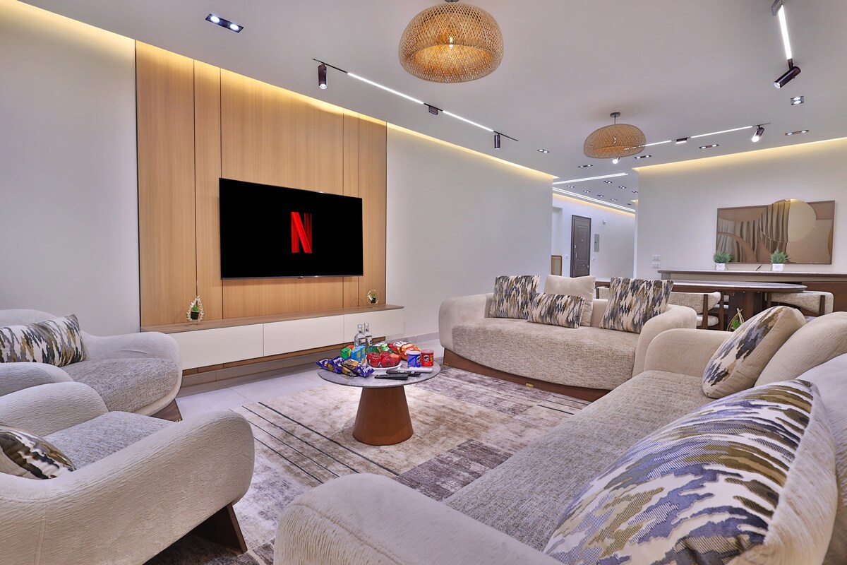 Uživajte u luksuznom boravku u ovom elegantnom i prostranom trosobnom stanu sa 3 kupatila, na idealnoj lokaciji u blizini tržnog centra City Stars. Potpuno opremljen, besprekorno čist, prikladan za porodice, savršen za grupe, sa Wi-Fi mrežom, liftom, jednostavnom prijavom i brzim pristupom restoranima, kafićima, prodavnicama i atrakcijama u Kairu.