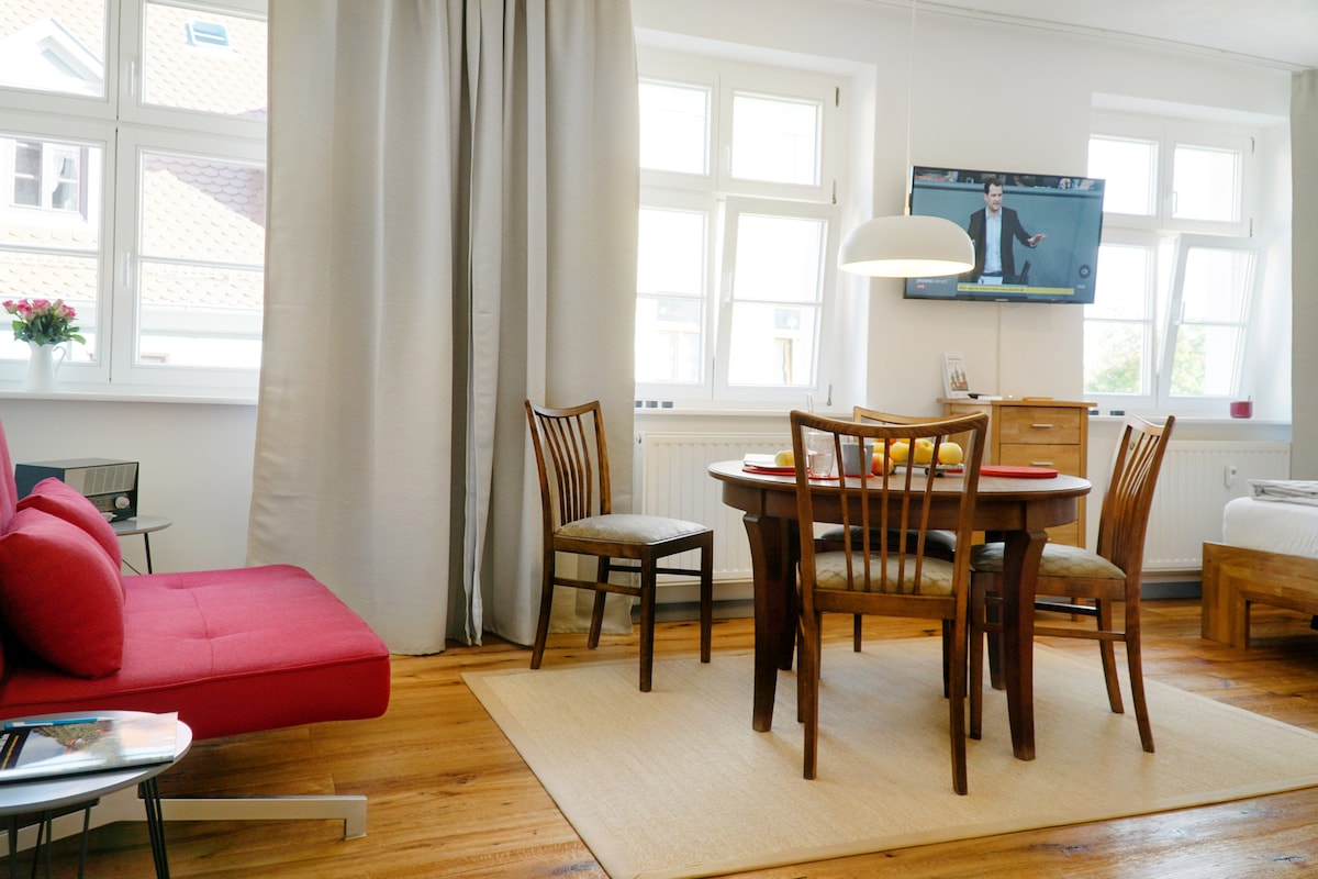 Stan (58 m²) se nalazi u centru i nalazi se na drugom spratu spomeničke kuće. Sastoji se od spavaće sobe, odvojene dnevne sobe, kuhinje i kupatila. Mala krovna terasa je dostupna sportski nastrojenim gostima kroz prozor kupatila. Stan je individualno, stilski i funkcionalno uređen. Bicikli se mogu odložiti ako je potrebno. Katedrala Naumburg, kao i tržni trg, udaljeni su oko 5 minuta hoda.