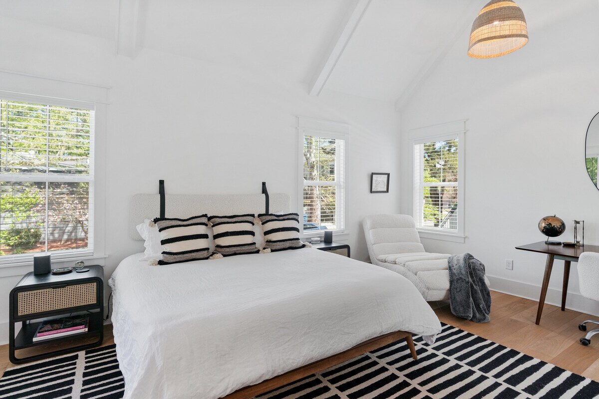 Idealno za parove koji putuju. 11’ plafoni u glavnom dnevnom boravku. 15’ katedralni plafoni u glavnoj spavaćoj sobi/kupatilu! TV od 82inča u spavaćoj sobi sa sistemom za kućno kino Sonos Dolby. Uđite u ormar/potpuno pranje veša u apartmanu. Prevelika tuš kabina sa dvostrukim protokom kojom upravlja Alexa, sa kadom i direktnim pristupom bašti/salonu. Vanjski salon sa prostorom za sedenje, 2 ležaljke za sunčanje, trpezarijski sto za 6 osoba sa suncobranom, roštilj na drveni ugalj/prostor za kuvanje na otvorenom. Potpuno opremljena kuhinja za kuvare. Kućna krstarica na plaži:)