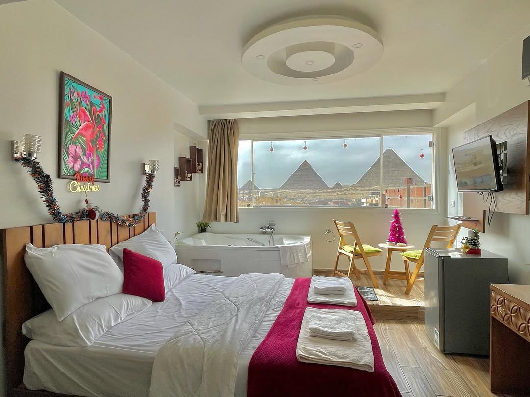 Unforgettable Giza! Our elegant room offers panoramic Pyramids views from a huge window. Features a private, in-room massage jacuzzi for ultimate relaxation. King-sized bed, modern design, and all essential amenities included. Perfectly located for exploring ancient wonders. Book your luxurious historical retreat!