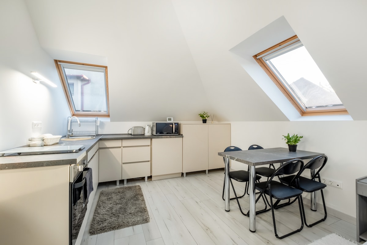 Otkrijte vrhunsku udobnost u živopisnom univerzitetskom okrugu Veszprem u savremenim studijima V Siti. Istražite okolinu sa lakoćom - prodavnice, kafići i namirnice u blizini. Parking je besplatan nakon 17:00. Klimatizovane jedinice, besplatan Wi-Fi, praktična čajna kuhinja, udoban prostor za sedenje i privatno kupatilo. Napomena: to je studio na spratu sa udobnim krevetom sa niskim plafonom. Vaše urbano utočište je spremno i čeka vas!