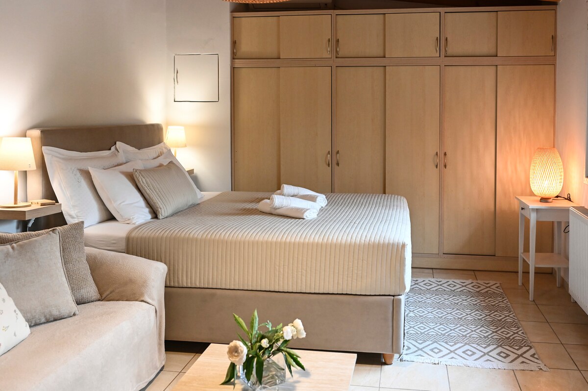 Dobro došli u svjež, prostran i moderan apartman u kojem je sve potpuno novo. Ovaj elegantni prostor ima luksuzni bračni krevet i savršeno se nalazi u centru Markopula, samo 7 minuta od Međunarodnog aerodroma u Atini. Uživajte u svim udobnostima doma, uključujući: Nespresso ✔ aparat za kafu ✔ BESPLATAN brzi WiFi ✔ Netflix strimovanje na pametnom TV-u od 55inča ✔ Sva osnovna oprema za udoban i opuštajući boravak Prevoz do aerodroma je dostupan na zahtjev, uz dodatnu naknadu.