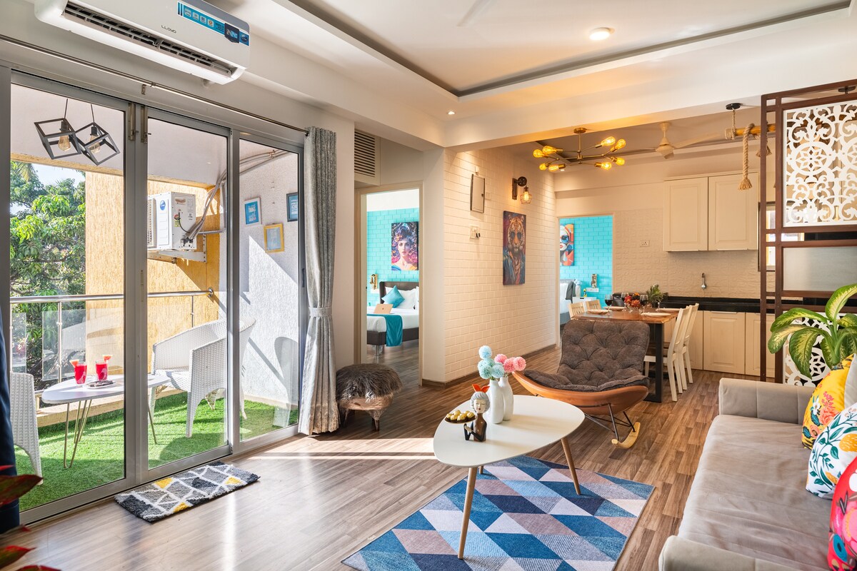 Dobro došli u dvorac White Feather, luksuzni 2BHK stan, samo nekoliko minuta od plaže Candolim u Sjevernoj Goi. Uživajte u zadivljujućem pogledu na bazen i rijeku sa svog privatnog balkona. Savršeno za porodice, parove i osobe koje rade na daljinu, sa brzom Wi-Fi mrežom, klimatizovanim domom, potpuno opremljenom kuhinjom, dnevnim čišćenjem, rezervnim napajanjem, bezbjednim parkingom sa bazenom i teretanom, sadržajima prikladnim za djecu. Koraci od živopisnih restorana, noćnog života i poznatih plaža. Rezervišite svoj spokojni i elegantni smještaj u Goanu već danas!