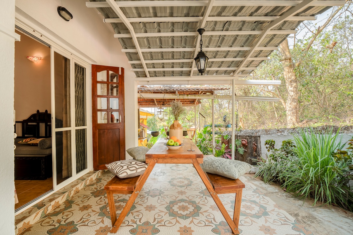 Smještena u slikovitom selu Moira u Severnoj Goi, ova moderna, savremena i udobna seoska kućica savršena je i za odmor i za rad. Potpuno opremljena nezavisna klimatizovana seoska kućica ima prostrani dnevni boravak otvorenog tipa sa kuhinjom, spavaću sobu sa kupatilom i bazenom. Ima svoju baštu, prostor za sedenje i prilaz, sa parkingom. Uživajte u miru i tišini sela Goan dok ste na kratkoj vožnji od svih glavnih atrakcija Severne Goe.