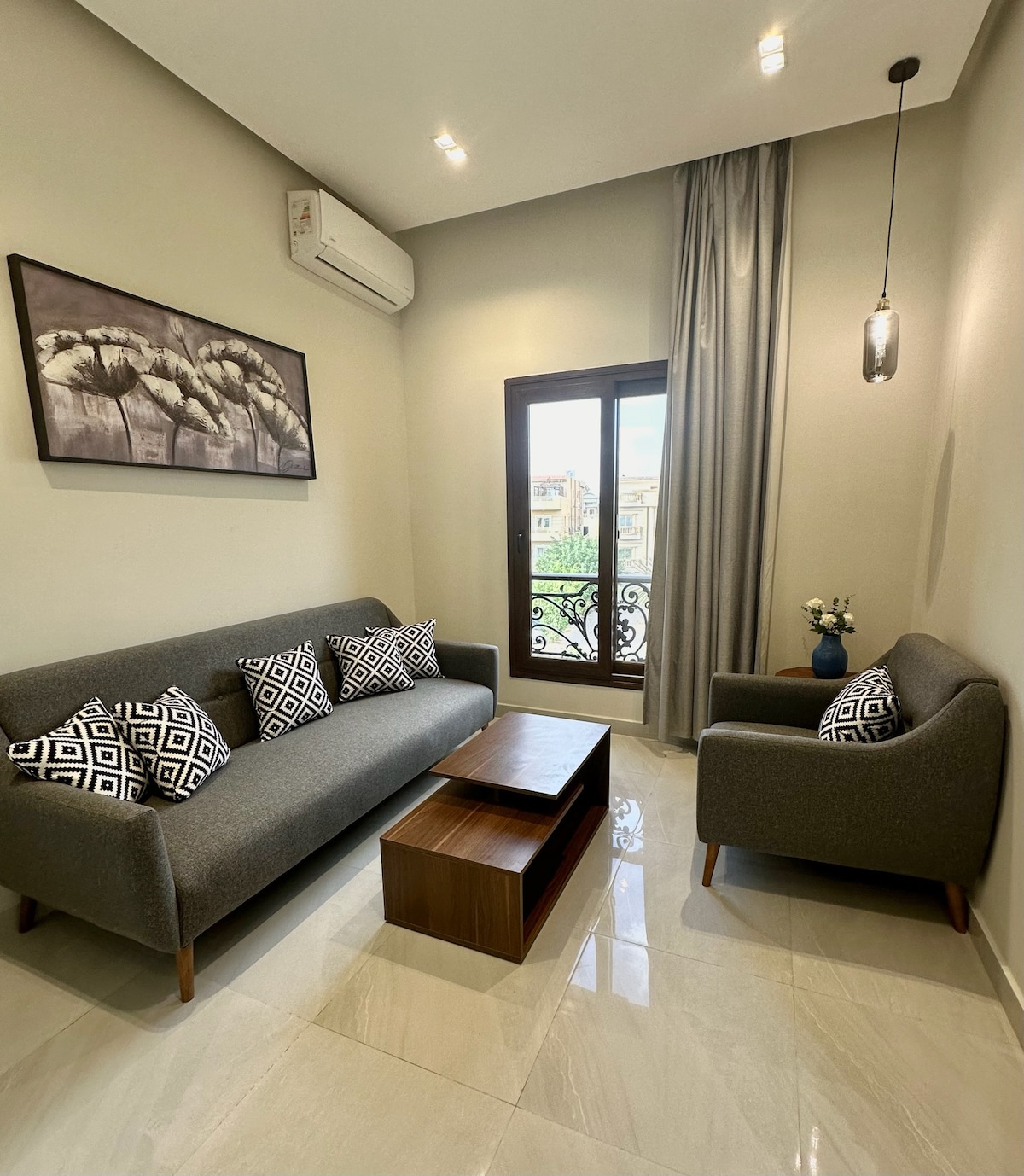 Udobni studiji u Novom Kairu nude savršen spoj udobnosti i praktičnosti. Ima udoban krevet s bijelom posteljinom, dobro opremljenu čajnu kuhinju sa šporetom,mikrotalasnom pećnicom i frižiderom i moderno kupatilo sa čistim peškirima. Uživajte u zadivljujućem pogledu na grad iz privatnog prostora za sjedenje na otvorenom i ostanite povezani sa brzim Wi-Fi mrežom i klima-uređajem. Samo nekoliko minuta od grada festivala u Kairu i aerodroma, ovaj renovirani studio pruža idealnu bazu za rad i opuštanje.