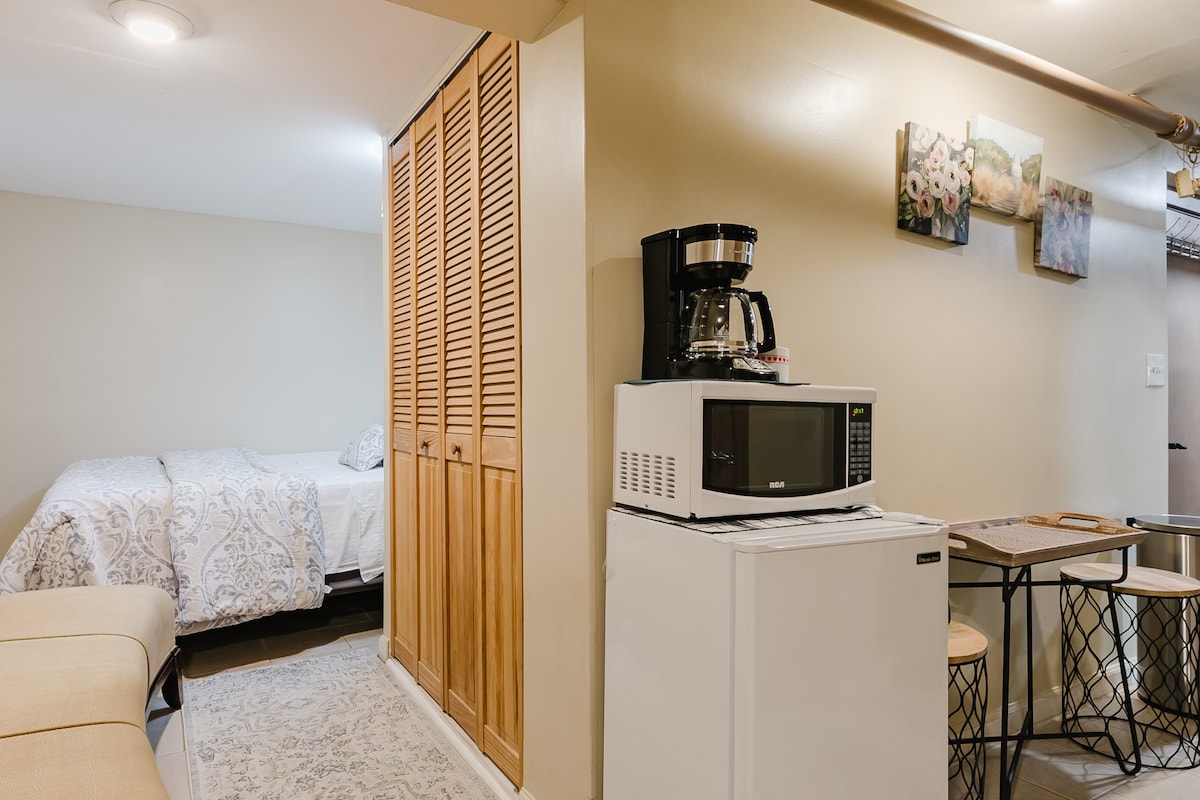 Uživajte u opuštajućem boravku u ovom jednosobnom studio apartmanu. Opremljen udobnim krevetom, čistim kupatilom, kuhinjom, frižiderom, mikrotalasnom pećnicom, sudoperom, radnom površinom i šporetom. - Jednosoban stan otvorenog tipa (za 1–2 odrasle osobe) – Privatni ulaz za pojedince (suteren) – Praktično i lako parkiranje na ulici - 5 minuta vožnje od stanice Metro North Railroad (stanica Mount Vernon East) koja omogućava pristup drugim delovima Vestčestera, Menhetna i CT područja.