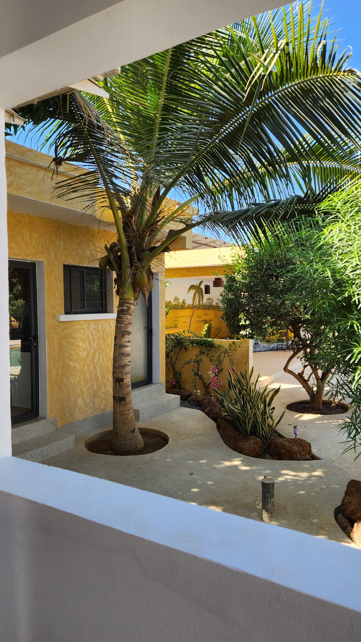 Villa au calme sur voie privée, noyée dans la verdure d'un authentique jardin tropical, située à l'intérieur d' une propriété privée de 3 villas indépendantes Piscine privée, climatisation, confort européen Ambiance intérieure recherchée Proche plage et commerces à pied (150m) Quartier calme proche toutes commodités, Accueil aéroport possible sur demande Adama le responsable de la maison, Ibou, notre gardien et Awa notre intendante sont à votre écoute pour la réussite de votre séjour.