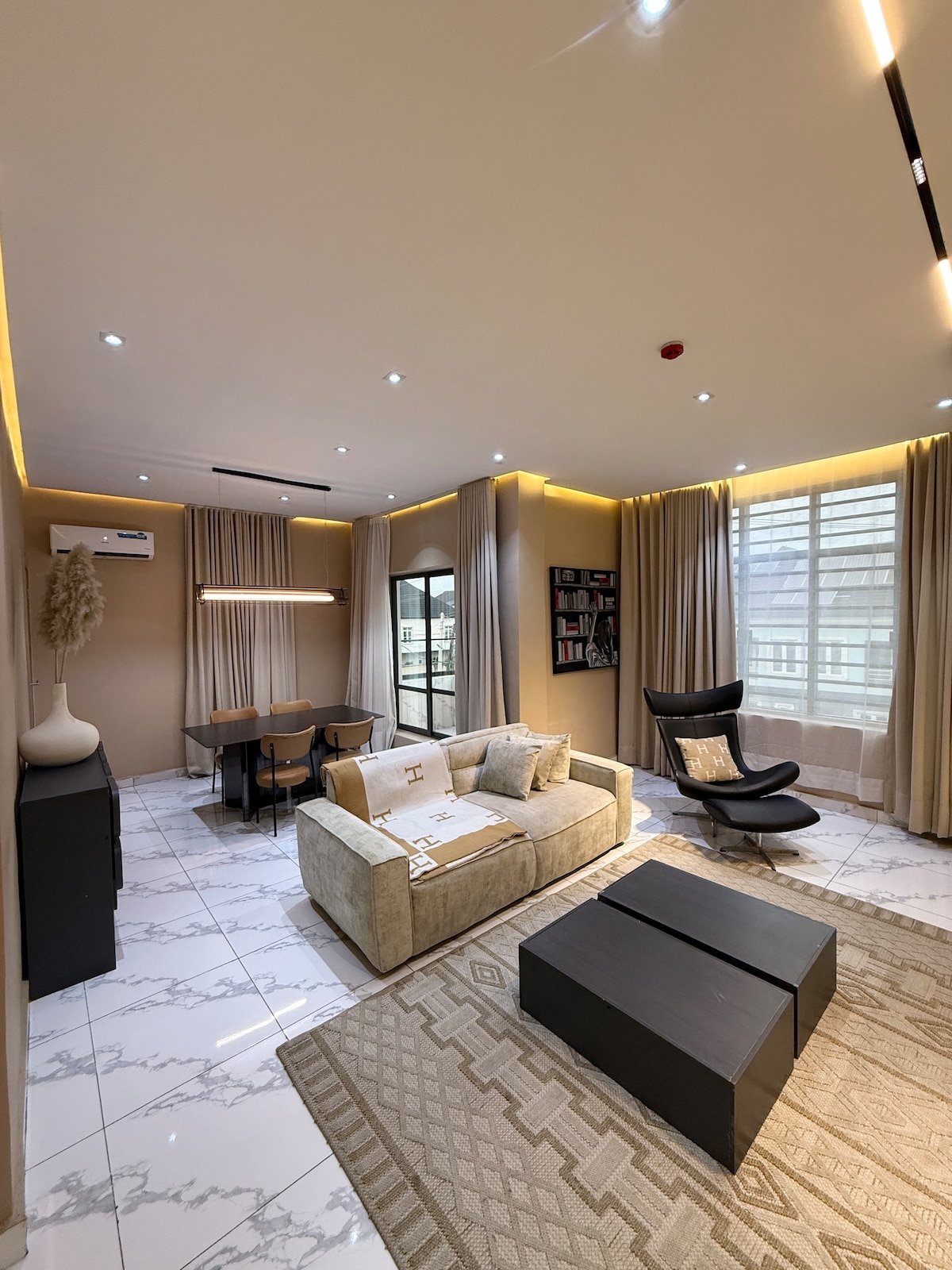 Pažljivo uređen trosobni stan u vrhunskom, dobro isplaniranom imanju u Vujeu, Abuja. Svaka spavaća soba ima namjenski radni prostor sa odgovarajućim stolovima i sjedištima, idealan za poslovne putnike, rad na daljinu i duže boravke. Uživajte u mirnom, modernom enterijeru, potpuno opremljenoj kuhinji i čajnoj kuhinji, pouzdanom napajanju i vodi, kao i sigurnom, spokojnom okruženju s jednostavnim pristupom ključnim poslovnim i životnim područjima. Dizajniran za udobnost, produktivnost i pravi doživljaj dobrodošlice.