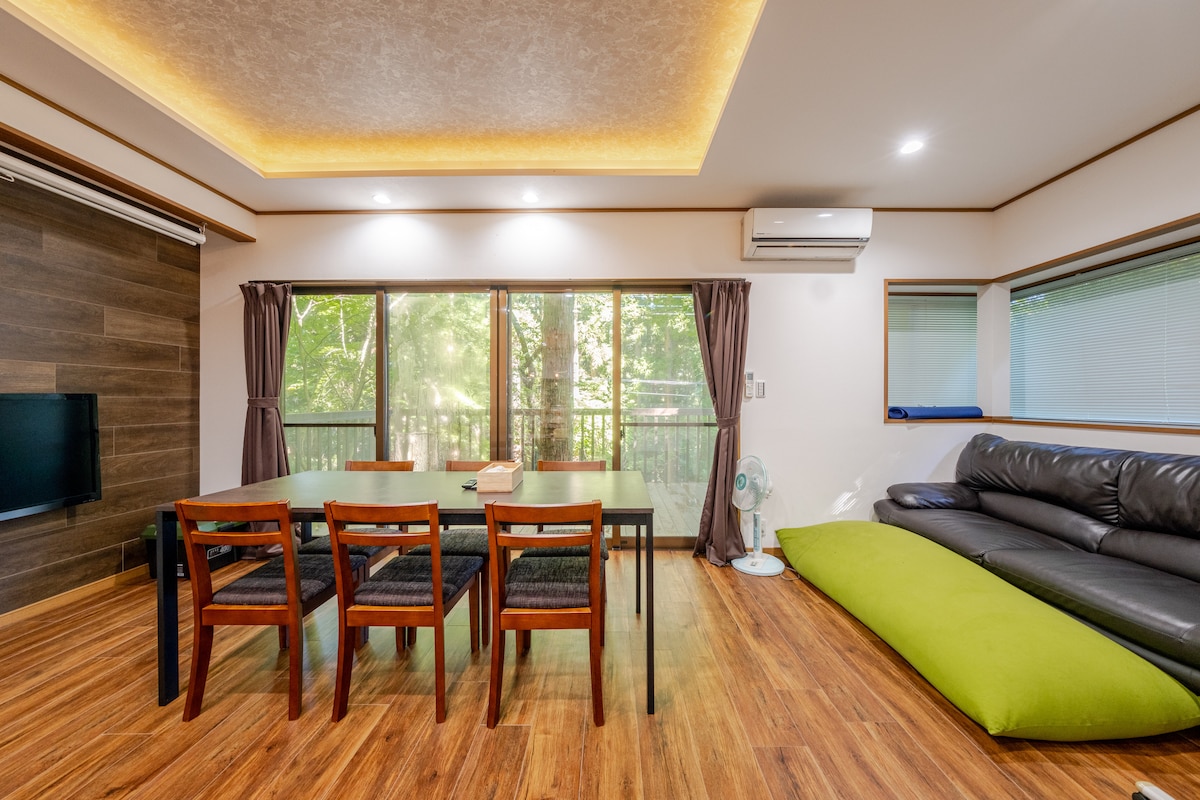 Vaše sopstveno skrovište za odrasle smješteno u šumi.Od pametne petlje Nasu Kogen, to je 12 minuta na opštem putu sa malo saobraćaja i saobraćaja. Takođe je udaljen 15 minuta vožnje od glavnih turističkih destinacija Nasu. Pošto je nadmorska visina viša od centra, temperatura je oko 10 stepeni hladnija nego u centru grada.Ljeti možete da se rashladite bez klima-uređaja. Zabavno vrijeme za provođenje vremena sa porodicom i prijateljima na suncu na prostranoj terasi. Napolju se nalazi veoma veliki prostor za roštilj.Na stolu su roletne, a na sofi su suncobrani, tako da možete da provedete opuštajuće vrijeme u šumi. Prostrani dnevni boravak i trpezarija su potpuno opremljeni sa 4K pozorištem od 120 inča, tako da možete da uživate u zatvorenom prostoru tokom kišnih dana. Napolju se nalazi veliko ognjište od 75 cm koje može da koristi rerna na dodir.Opustite se i uživajte u posebnom prostoru u kojem možete da uživate u izvanrednom prostoru dok odmarate svoje srce od fluktuacije vatre.Svijet zelenila gdje god da pogledate prirodno drveće koje se koristi za zidove i podove.Opustite se u ljepoti zelenila. Može se konsultovati parking za četiri automobila i pet automobila.