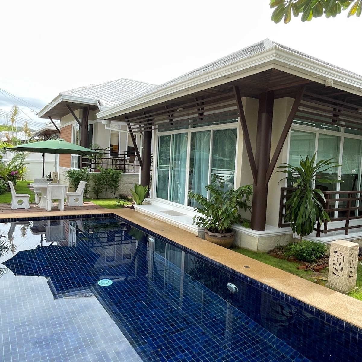 Lijepa trosobna vila sa 2 kupatila, potpuno opremljena evropska kuhinja sa trpezarijom. Klima-uređaj i plafonski ventilatori u svim prostorijama. Besplatan brzi WIFI (Fiber). Dnevni boravak ima pametni TV od 55"i IPTV. Privatni bazen sa slanom vodom i jacuzzijem. Privatna bašta sa ležaljkama i spoljnim tušem. Spoljašnji prostor ima trpezariju i prostor za sjedenje sa plafonskim ventilatorom. Električni 8THB po kwh i voda 60THB po m3 nije uključen i mora se platiti zasebno korišćenjem prije odjave. 2 automobila u objektu.