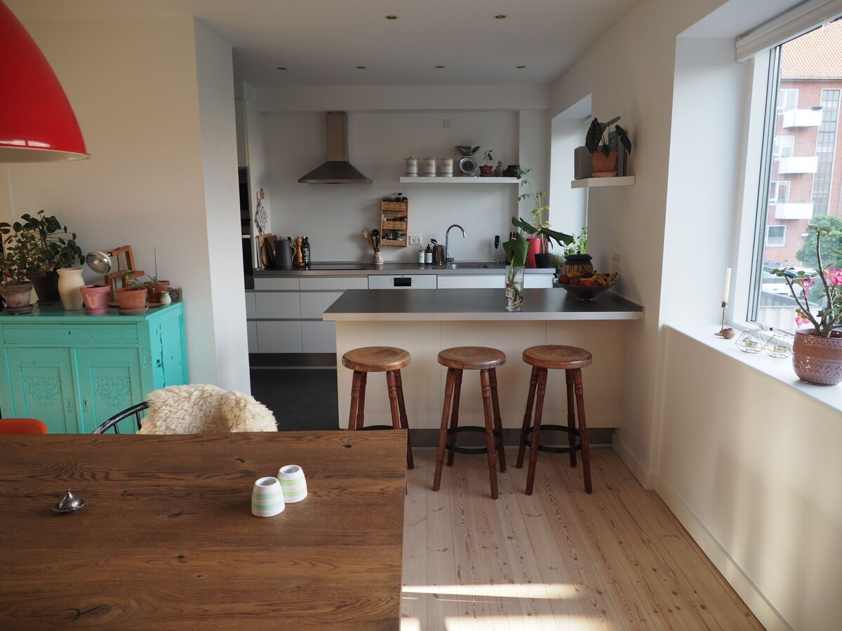 Na ovoj adresi ćete pronaći prostran stan u udobnom Skibhuskvarteru sa 2 balkona i velikom kuhinjom/dnevnim boravkom. Stan je u blizini prodavnice, kao i popularne luke i Storms Pakhus. Sa balkona se pruža pogled na dvorište i prelijepu crkvu gdje možete uživati na suncu cijeli dan. Ako želite, možemo da nadoknadimo do 1-2 dodatne osobe na dvostrukom dušeku. Drago nam je što možemo da vam poželimo dobrodošlicu
