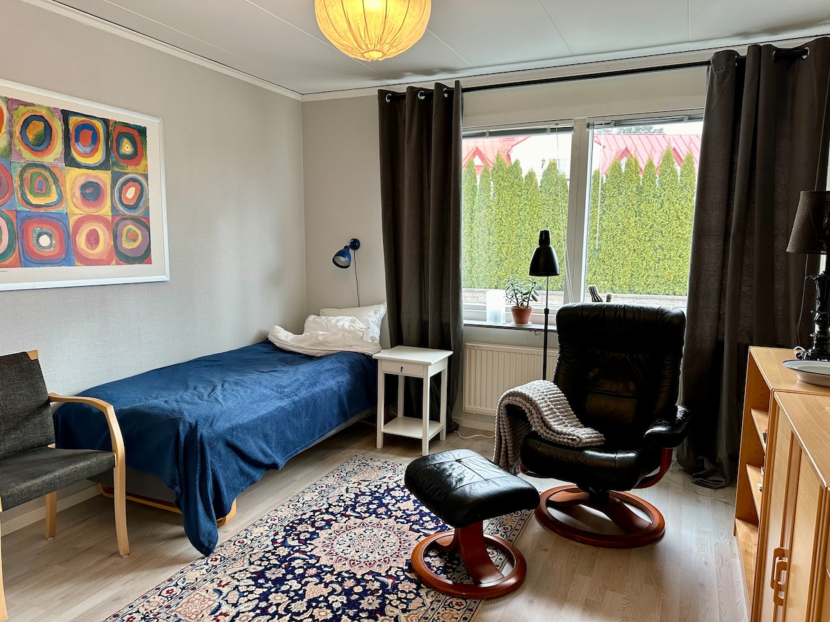 Privat small apartment with a separate entrance in a house from 1969. Nice, quiet and comfortable -perfect for one person and to stay longer. Full equipped smaller kitchen and a bathroom with shower, washing machine,comfortable bed, armchair, lots of wardrobes. You live by yourself and you don’t share anything. Gamla Uppsala is 4 km north of Uppsala city, nice, quiet and very close to the nature. The highway E4 is close and you can go by bus, bike or walk to city, it’s 100m to the busstop.