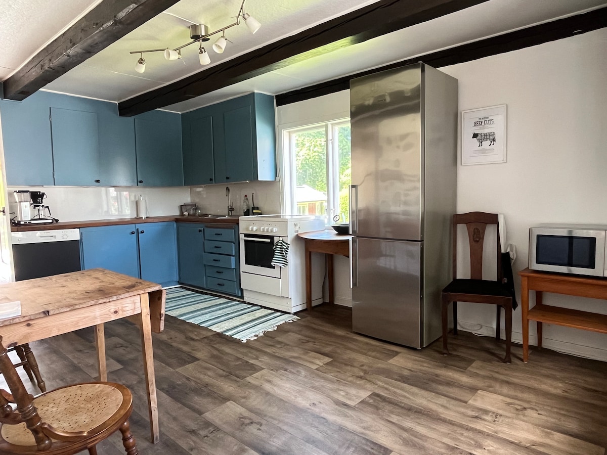 Budite udobni i mirni u staroj dužini od pola drveta od devetnaestog vijeka. Lokacija je ruralna sa životinjama i prirodom odmah ispred vrata, ali u isto vrijeme u blizini grada, restorana, zabave, kupovine i plaže/plivanja. Ovdje živite mirno i prostrano od oko 120 m2 sa 2 spavaće sobe, kuhinjom, velikim dnevnim boravkom sa sofom, TV-om i trpezarijom, kao i kupatilom sa WC šoljom, tušem, mašinom za pranje i sušenje veša. Pored kuće se nalazi bujno, skrovito dvorište sa roštiljem odmah pored pašnjaka sa ovcama i konjima. Automobil možete da parkirate odmah ispred.
