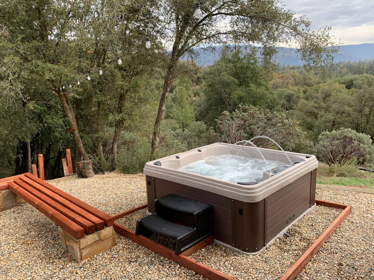 WELCOME to your perfect Mountain Escape LOCATION: 20 minutes to the Yosemite gate and 10 minutes to Bass Lake, this charming mountain home offers a tranquil retreat with beautiful scenery. OUTDOOR AMENITIES: The back patio features a BBQ Area, and a large Hot Tub under a canopy of oak trees with patio lights. The front patio features a PROPANE FIRE PIT with ample seating. INTERIOR: Master bedroom has a CAL King bed with a en-suite shower. 2nd bedroom has a Queen bed.3rd bedroom two bunk bed