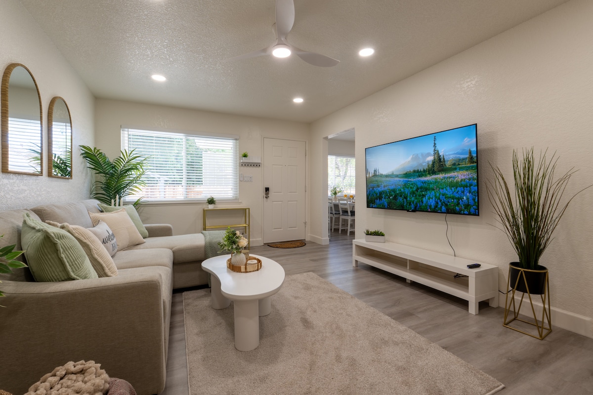 Stay at our peaceful home located in Foothill Farms area in Sacramento! Near to I 80 Fwy and less than 20min away from Hospitals and Malls. Target & Walmart and variety of restaurants (In-n-Out, Chick-fil-A, Sushi, etc) 13mi/20min from Sac Airport Provided is a remodeled 2 bed 1 bath duplex, w/ spacious living and bedrooms. New kitchen and dining area. Living room has a comfortable couch, 55” smart tv and bright ambiance. Room 1 King Puffy luxe mattress Room 2 Queen firm mattress, work space
