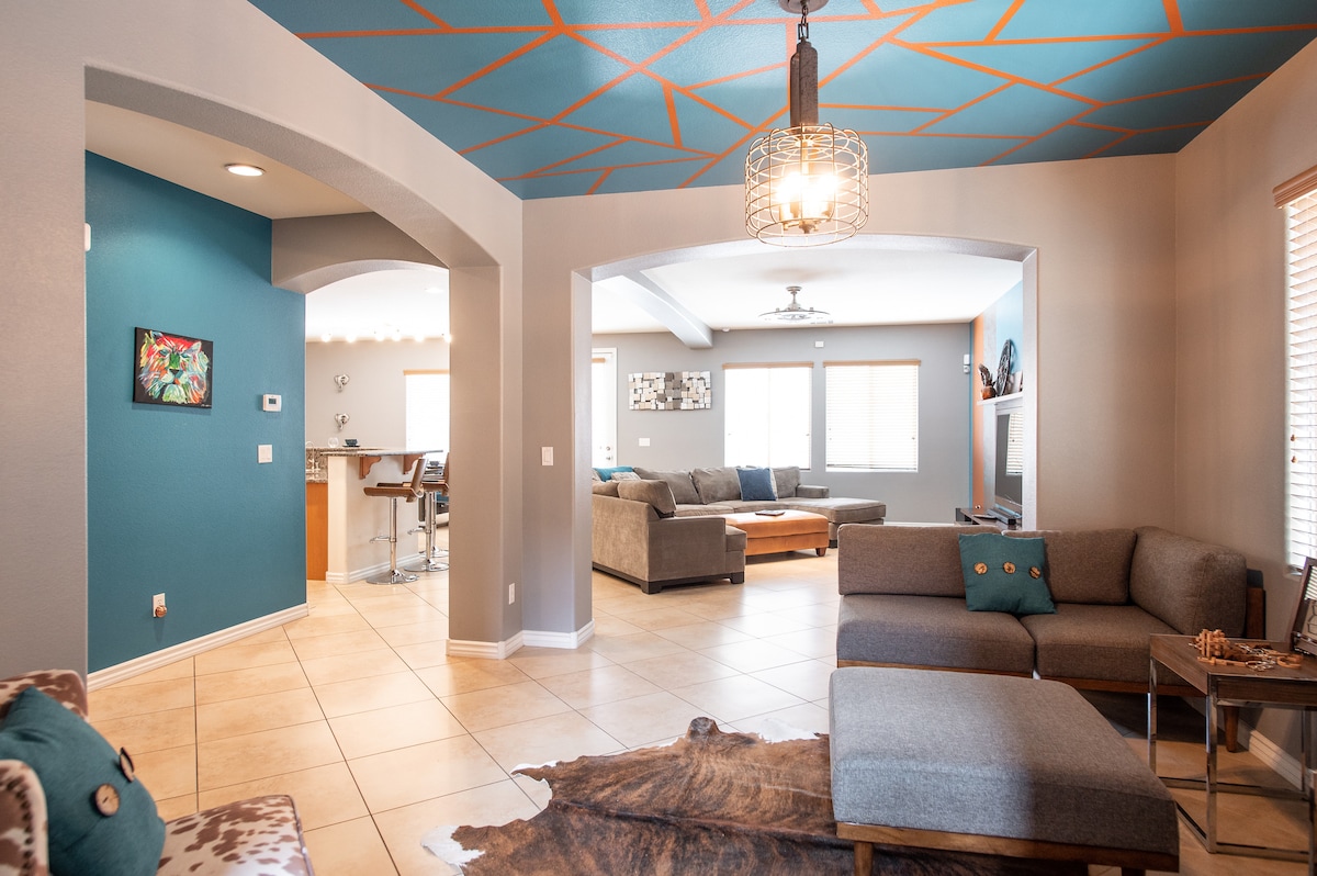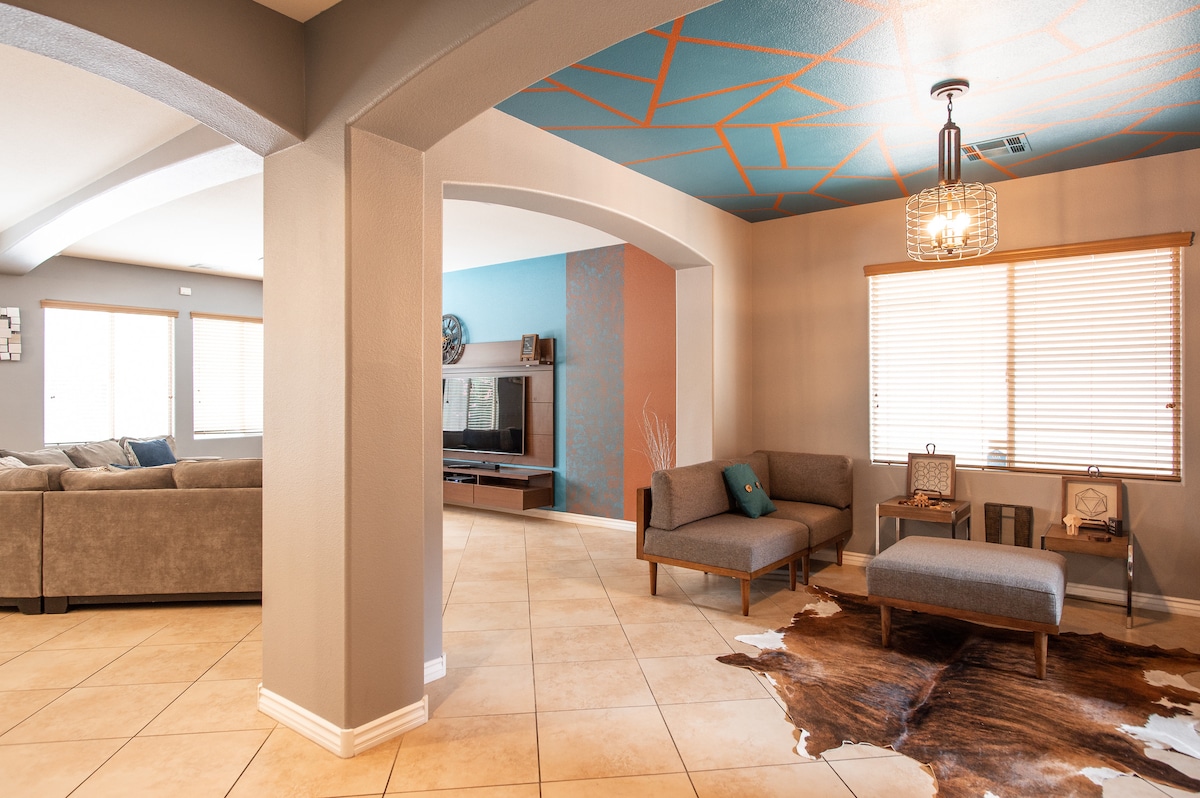 Svježe renoviran Las Vegas dom daleko od doma sa oazom bazena u odmaralištu, prilagođenim baštama sa ognjištem, novim modernim jacuzzijem Klirvoter sa više od 100 mlaznica i vodenim sadržajima u kojima možete da se opustite i uživate, spoljnom kuhinjom sa roštiljem i zabavnim prostorom za igru na otvorenom! Ova kuća za jednu porodicu sa kućicom nalazi se svega nekoliko minuta od avantura na otvorenom, uzbuđenja i omiljenih lokalnih atrakcija. Uživajte u opuštenom modernom boemskom stilu sa pažljivo osmišljenim detaljima kako biste obezbijedili udoban i nezaboravan boravak.