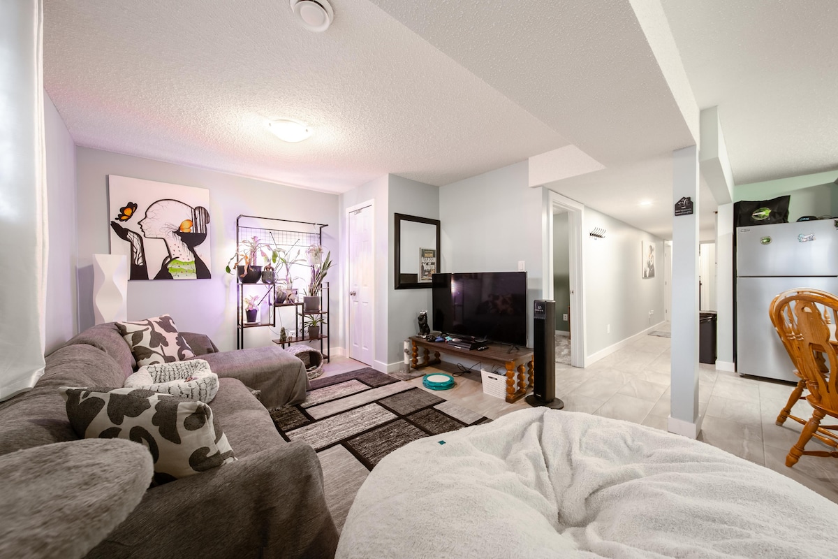 Privatni podrumski apartman sa plafonima od 8'i mnogo prirodnog svjetla! Sopstveni ulaz vodi do apartmana na osami sa svim sadržajima koji će vam biti potrebni tokom boravka. Mala terasa znači da možete uživati u jutarnjoj kafi na suncu! Luksuzna posteljina, 55' HD TV koji uključuje Netflix, Prime i Disney+ za uživanje dok se opuštate! Smještena u centru Edmontona, zajednica ima privatno jezero, voćnjak jabuka i park za igru. Besplatan parking na sporednim uličnim stepenicama od apartmana. Kućni ljubimci su dobrodošli!
